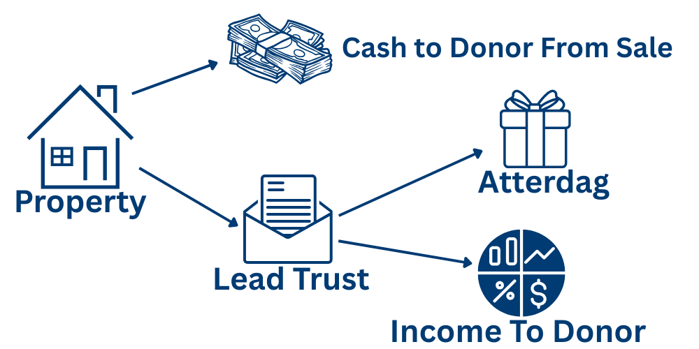 Flowchart: Donor transfers an undivided portion of property to a unitrust. When property is sold, the donor and the unitrust receive cash from the sale. The donor receives payouts from the unitrust and Atterdag receives the remainder at the end of the trust term.